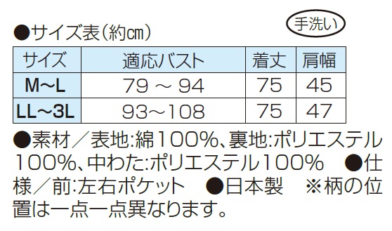 ●素材/表地:綿100%、裏地:ポリエステル100%、中わた:ポリエステル100%