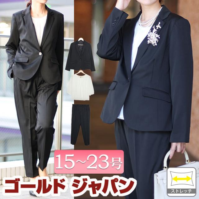 秋新作 大きいサイズ レディース スーツ セットアップ テーラードジャケット&ブラウス&パンツ3点セットスーツ セット ジャケット パンツ ブラウス ビジネス フォーマル セレモニー 通勤 伸縮 秋服 春服 15号 17号 19号 21号 23号 ブラック 黒 ネイビー ゴールドジャパン