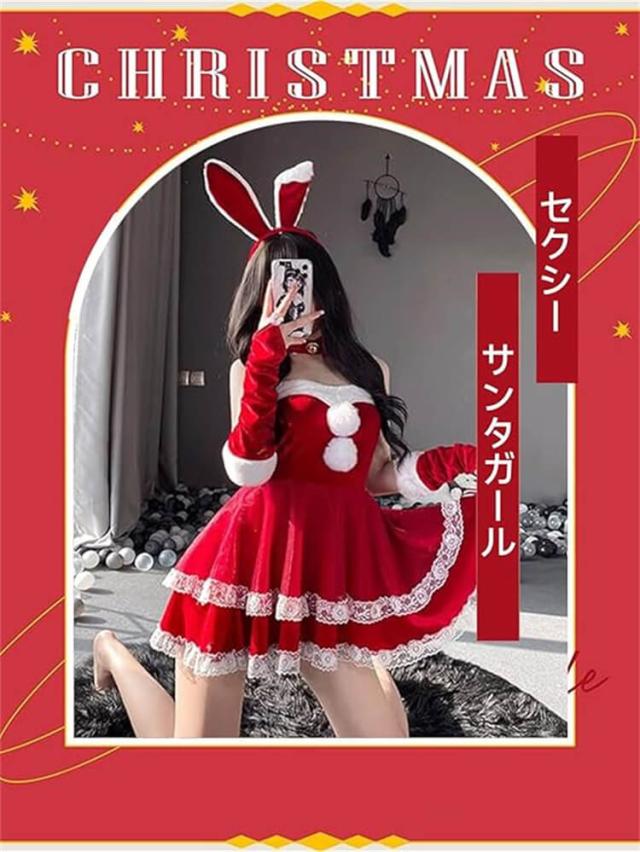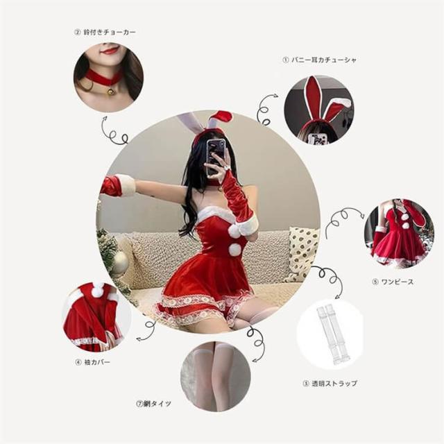 【豪華な6点セット】:サンタコスプレ用ワンピース*1、うさ耳カチューシャ*1、鈴付きチョーカー*1、透明ストラップ*2、袖カバー*2、ストッキング*1 ★サンタガール衣装に必要なものがセットになっており、お手軽に可愛いサンタコスを完成させます。