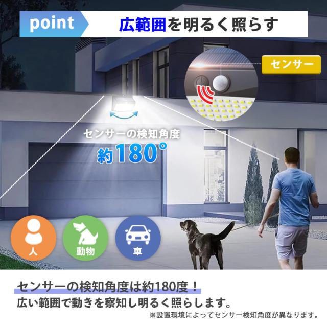 センサーの検知角度約180度なので広い範囲で人、動物、車などの