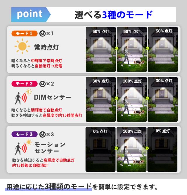 モード2:DIMセンサー 暗くなると弱輝度で自動点灯、動きを検知すると高輝度で約15秒間点灯