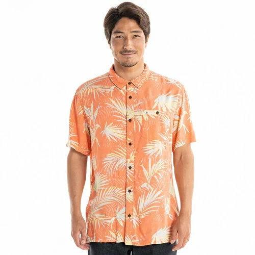 ボードショーツとリンクしたシーズングラフィックのトロピカル柄をプリントした半袖レーヨンシャツ。
