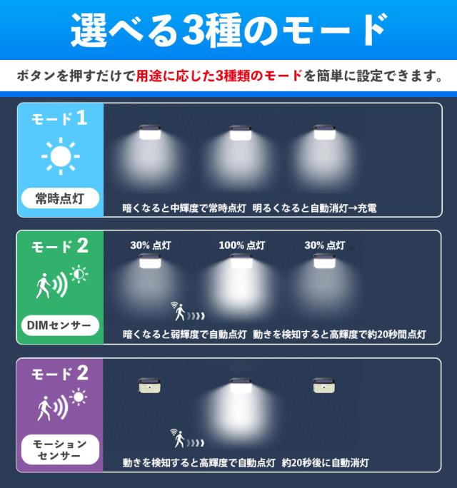 モード2:DIMセンサー 暗くなると弱輝度で自動点灯、動きを検知すると高輝度で約15秒間点灯