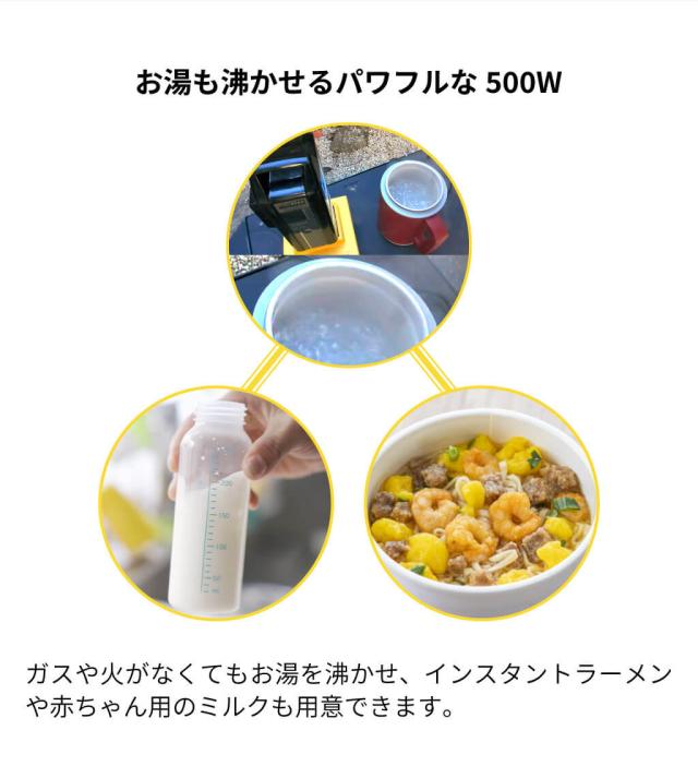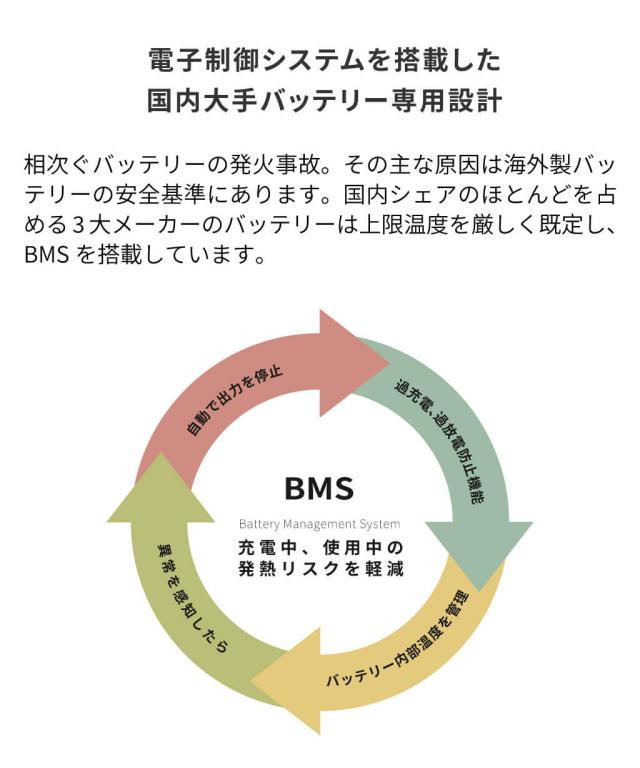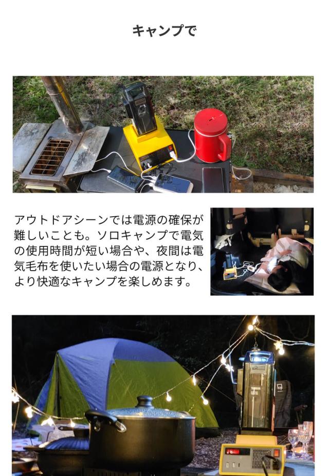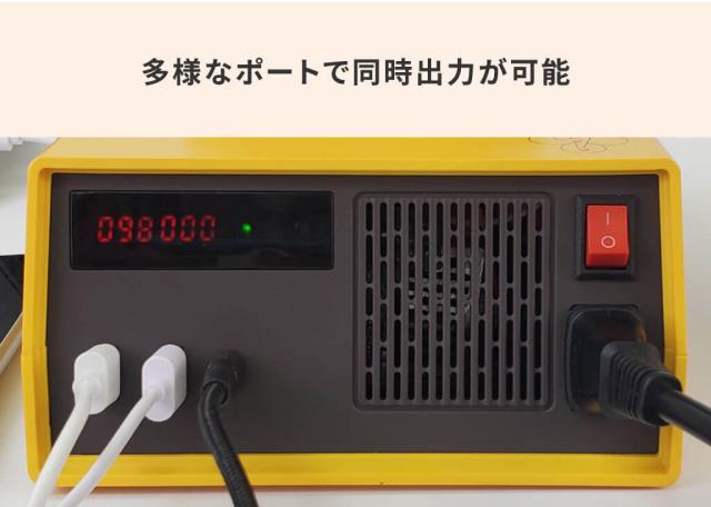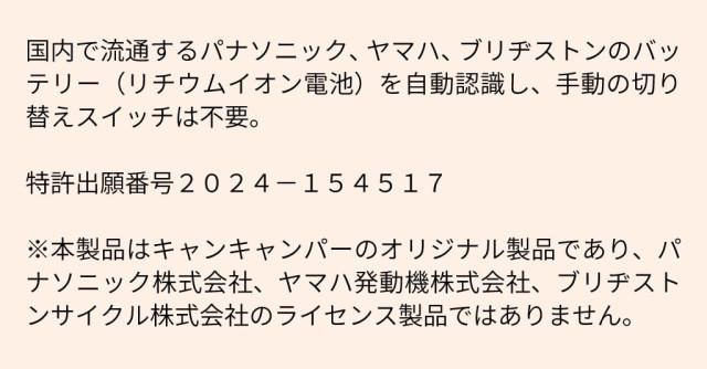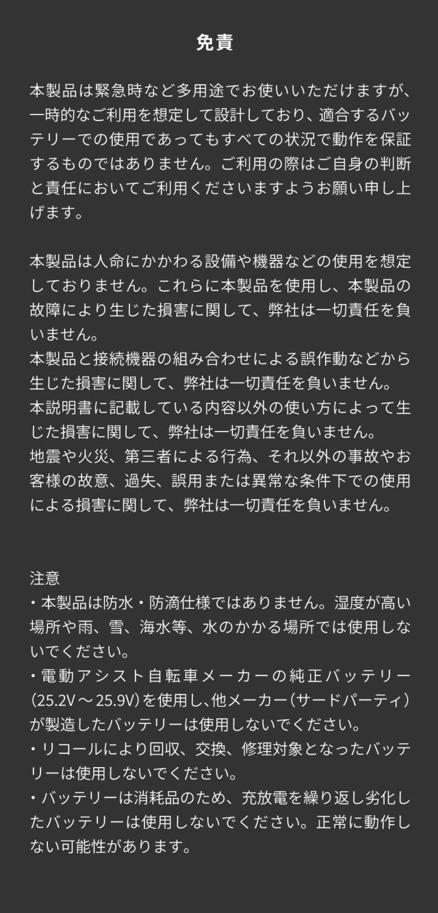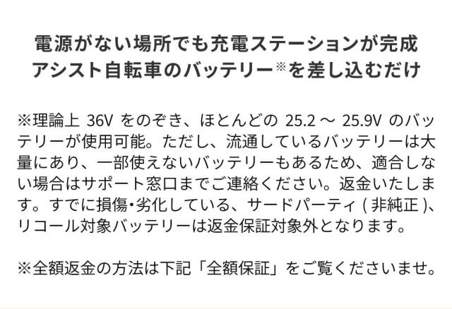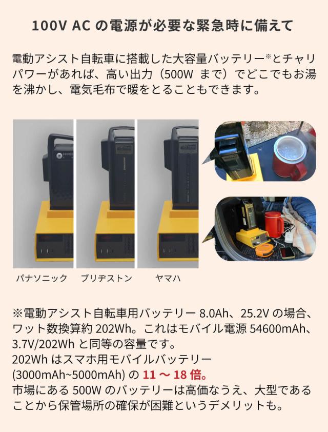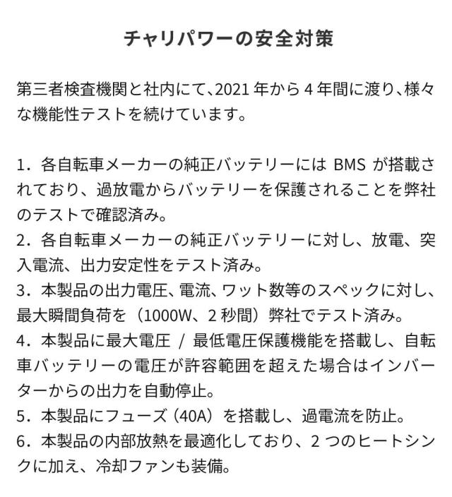 | 【 電動アシスト自転車のバッテリーがポータブル電源に早変わり】緊急時やアウトドア、キャンプ、防災時に電動アシスト自転車のバッテリーをポータブル電源としてお使いいただけます。 【 500Wまで出力ができる 】電動アシスト自転車に搭載した大容量バッテリーとチャリパワーがあれば、高い出力(500Wまで)で電気製品をお使いいただけます。 【 多様なポートで同時出力 】AC出力(コンセント)、USB-C(Power Delivery)、USB-A(2口)を同時に出力が可能です。 【 安全対策 】第三者検査機関と社内にて、2021年から4年間に渡り、様々な機能性テストを続けています。1.各自転車メーカーの純正バッテリーにはBMSが搭載されており、過放電からバッテリーを保護されることを弊社のテストで確認済み。2.各自転車メーカーの純正バッテリーに対し、放電、突入電流、出力安定性をテスト済み。3.本製品の出力電圧、電流、ワット数等のスペックに対し、最大瞬間負荷を(1000W、2秒間)弊社でテスト済み。4.本製品に最大電圧/最低電圧保護機能を搭載し、自転車バッテリーの電圧が許容範囲を超えた場合はインバーターからの出力を自動停止。5.本製品にフューズ (40A)を搭載し、過電流を防止。6.本製品の内部放熱を最適化しており、2つのヒートシンクに加え、冷却ファンも装備。 【対応バッテリー】ヤマハ、ブリヂストン、パナソニックの25.2Vから25.9Vの純正バッテリーに対応。 |
