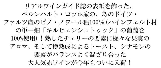 リアルワインガイド誌の表紙を飾った、 ベルンハルト・コッホ家の、あのドイツ・ ファルツ産のピノ・ノワール種100%(ハインフェルト村 の単一畑「キルヒェンシュトゥック」の葡萄を 100%使用)!熟したチェリーの要素に様々な果実の アロマ、そして樽熟成によるトースト、シナモンの 要素がバランスよく混ざり合った 大人気赤ワインが今年もついに入荷!