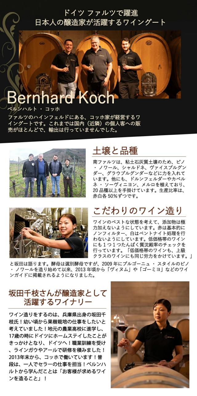【ベルンハルト・コッホは、ファルツのハインフェルト村のワイナリーです。全体で50haの畑を所有し、様々な葡萄品種から素晴らしいワインを生産し続けています。個人生産者には珍しく、ゼクトも自社で生産、瓶詰を行なっており、その品質の高さには驚かされます。リースリングやシルヴァーナーといったドイツらしい品種の他、ブルゴーニュ系の品種にも強く、特にシュペートブルグンダー(ピノ・ノワール)に定評があります。