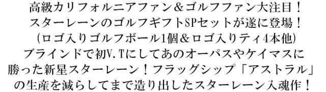 高級カリフォルニアファン&ゴルフファン大注目! スターレーンのゴルフギフトSPセットが遂に登場! (ロゴ入りゴルフボール1個&ロゴ入りティ4本他) ブラインドで初V.Tにしてあのオーパスやケイマスに 勝った新星スターレーン!フラッグシップ「アストラル」 の生産を減らしてまで造り出したスターレーン入魂作!