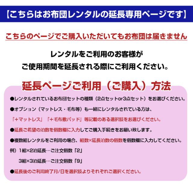 1点or2点セット用 レンタル延長専用ページ レンタル 布団セット ※こちらはお布団レンタルの延長専用ページです。すでにレンタルをされている方が延長される際にご利用ください。こちらをご購入いただいてもお布団は届きません。