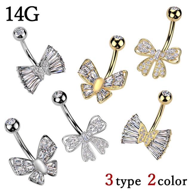 ヘソピアス 14G バナナバーベル リボン バタフライ 蝶 ジュエル ジュエリー シルバー ゴールド ボディピアス へそピ ボディーピアス ボディピ 316L サージカル ステンレス