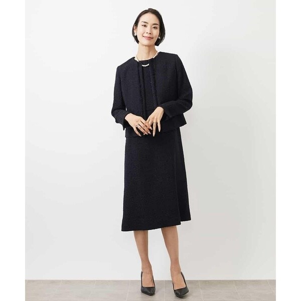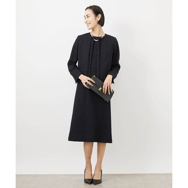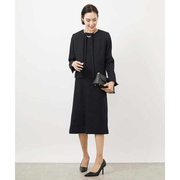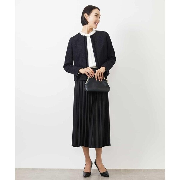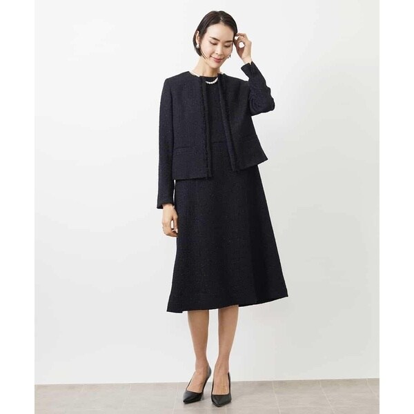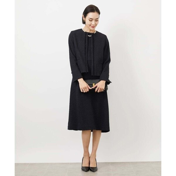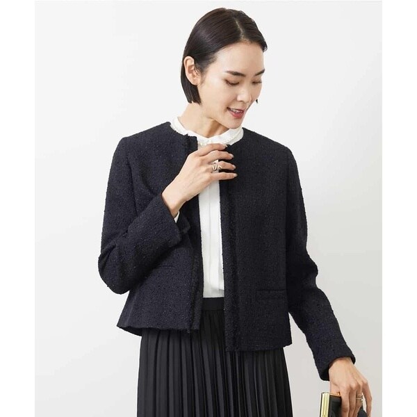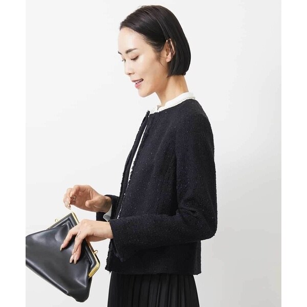 セレモニーにぴったりな、華やかで上品見えするツイードのノーカラージャケットです。