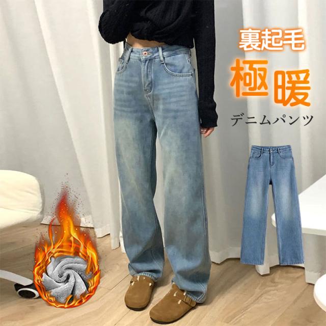 デニムパンツ レディース 裏起毛 ワイドパンツ ジーンズ カジュアル 防風 あったか 裏ボア 無地 着痩せ 着回し ゆったり シン