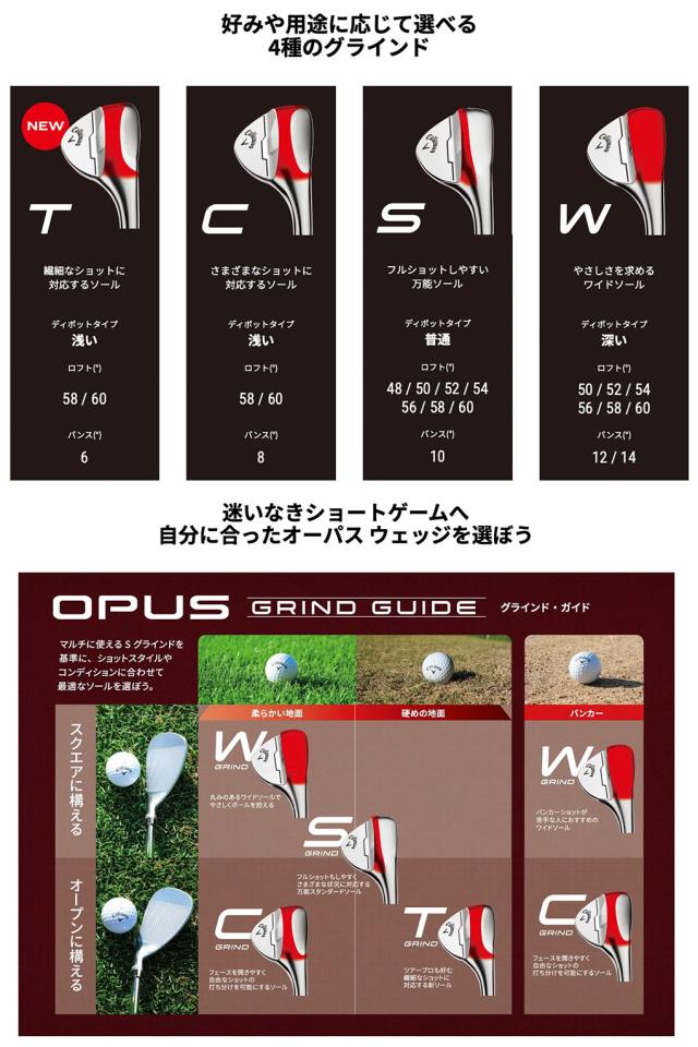 キャロウェイの新製品、「OPUSウェッジ」の名前は、カリフォルニアの最高級ワインをつくるワイナリー名を参考にしてつけられました。それほどに、極上なモデルを目指したということになります。リーディングエッジにやや丸みがあり、ティアドロップ型がより強調されているシェイプは、ツアープレーヤーとの入念なコミュニケーションをもとに、何度も改良を重ねて完成。フェース面では、鋭い37Vグルーブの角をキープしながら溝の幅を小さくして間隔を狭めることで、従来よりも本数が2本増加し、とくにラフやウェットなライでのスピン性能とコントロール性が大幅にアップしました。好評だったJAWS FORGEDウェッジのブラスト処理を引き継ぎ、キャロウェイ独自のマイクロフィーチャーも変わらず採用。グラインドには、従来のS、W、Cに加えてTグラインドが登場し、ロフトは48度から60度まで2度刻みの7種類がラインアップされています。