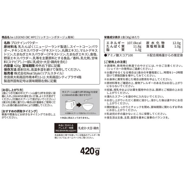 数量限定 ビーレジェンド OIC MPC HOT プロテイン リッチコーンポタージュ風味 420g ダイエット 減量 たんぱく質 朝食