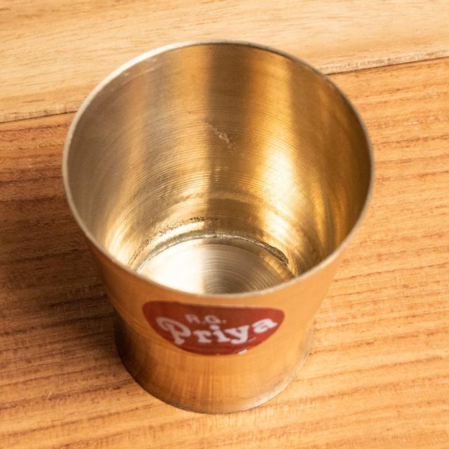 インド現地では礼拝を行う時にガンジス河の水を入れたり、神様への捧げ物の容器として主に使用されるブラスのカップです。古来よりインドではブラスは高級な金属とされ、仏像を作るのに使われたり、宗教用品にはほぼ必ず銅か、ブラスが使われてきました。手のひらに収まる小ぶりな、かわいらしいサイズ感のブラスカップ。模様として入っている横ラインは持つときの滑り止めにもなり、見た目の美しさと実用性を兼ねています。