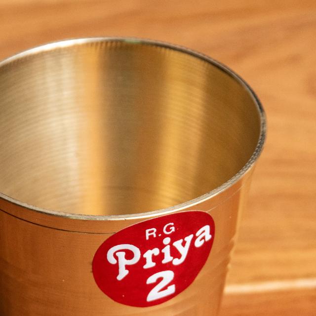 インド現地では礼拝を行う時にガンジス河の水を入れたり、神様への捧げ物の容器として主に使用されるブラスのカップです。古来よりインドではブラスは高級な金属とされ、仏像を作るのに使われたり、宗教用品にはほぼ必ず銅か、ブラスが使われてきました。手のひらに収まる小ぶりな、かわいらしいサイズ感のブラスカップ。模様として入っている横ラインは持つときの滑り止めにもなり、見た目の美しさと実用性を兼ねています。