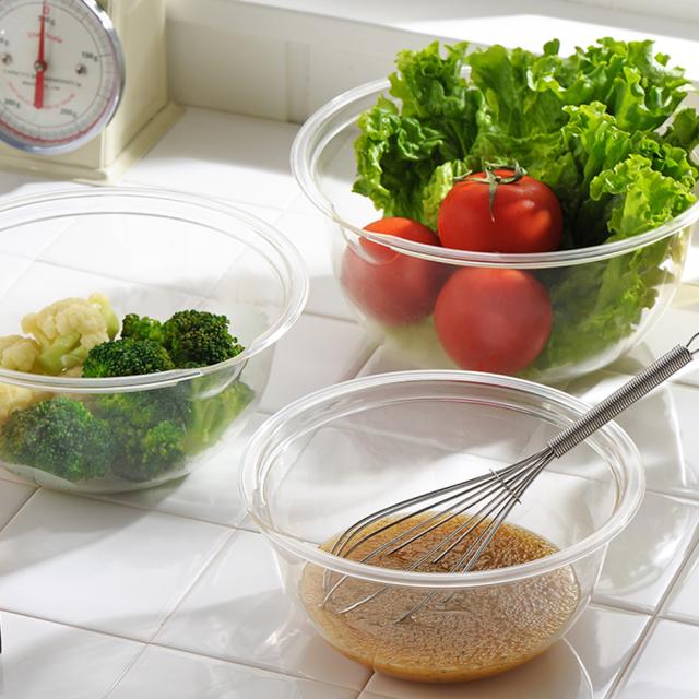 ガラスのように透明度が高く、中身が分かりやすい電子レンジ対応ボウル。