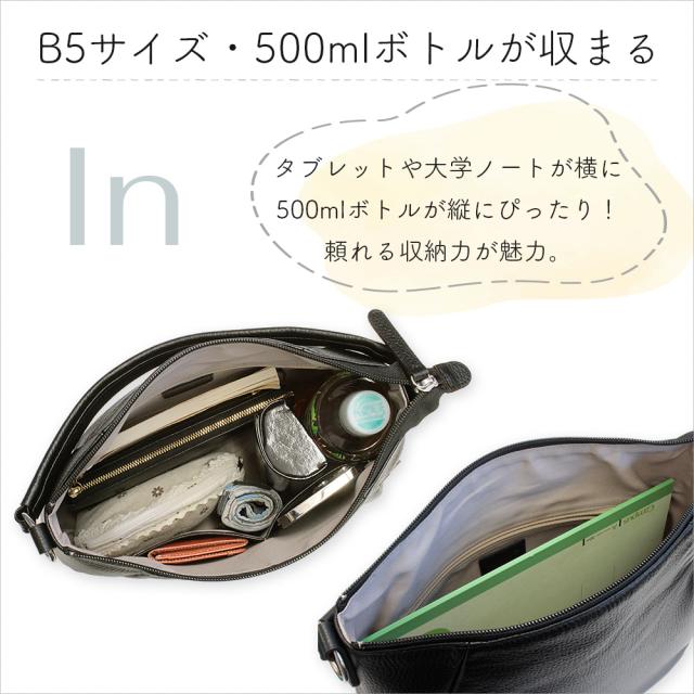 高級感のあるシュリンク本革を採用し、傷がつきにくい丈夫なつくり、 500mlペットボトルも縦に収納できる使いやすいサイズ感で、B5ノートやタブレットもラクラク収まります。