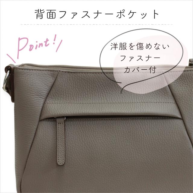 マチがしっかりあるので見た目以上の収納力も魅力。 内外ポケットも充実し、背面ファスナーには洋服を傷めないカバー付き等、使い心地にも細部までこだわった2wayバッグです。