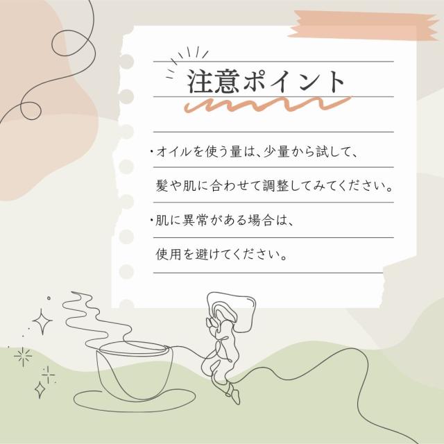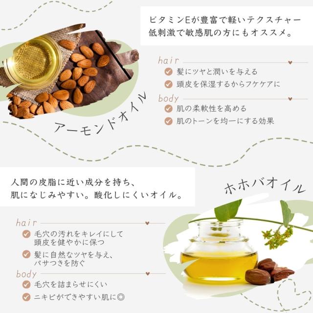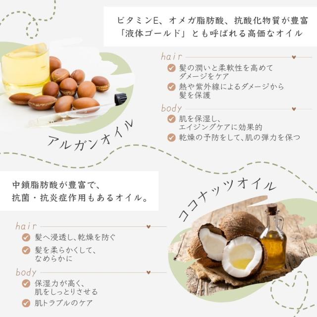 このオイルには、アーモンドオイルやホホバオイル、アルガンオイル、ココナッツオイルといった植物由来の自然な成分をたっぷり配合。乾燥が気になる季節や、髪や肌のダメージが気になるときに頼れるアイテムです。