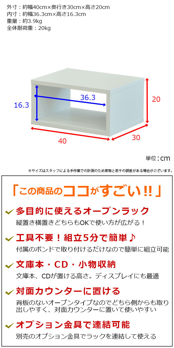 オープンラック 1段 40×20 3個セット 奥行30cm A4対応 収納 棚 ホワイト 白 おしゃれ 組み合わせ自由 幅40cm 高さ20cm 頑丈 耐荷重20kg 積み重ね 収納 ラック ディスプレイラック 卓上ラック 飾り棚 本棚 コミック 漫画 雑誌 アクスタ 机上ラック モニター台 木製