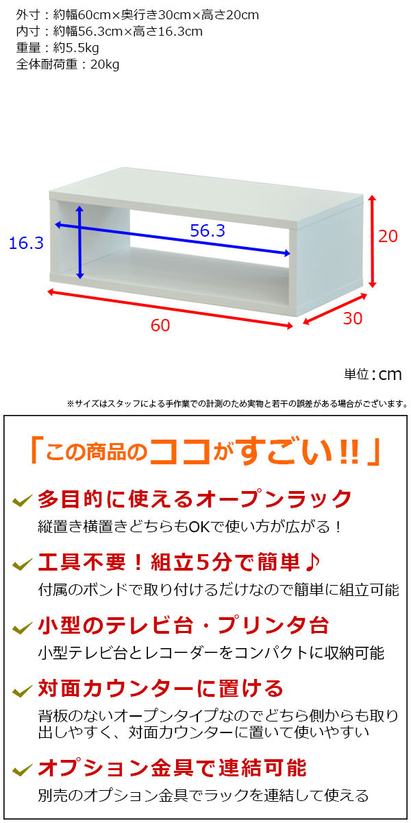 外寸:幅60cm 奥行き30cm 高さ20cm(60×30×20)