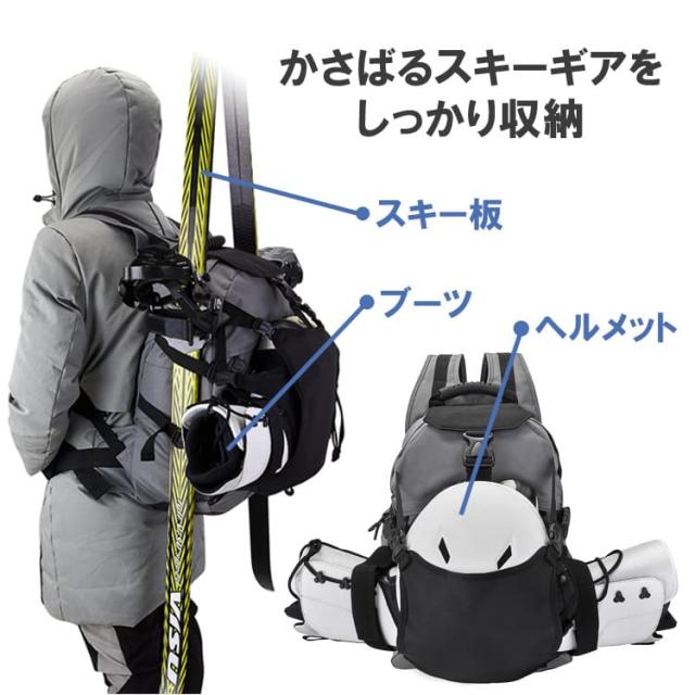 スキー板やブーツ、ヘルメットなどたっぷり収納できるスキーリュックです。