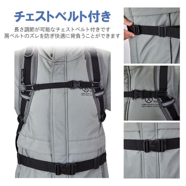 長さ調節が可能なチェストベルト付きで、肩ベルトのズレを防ぎ快適に背負うことができます。