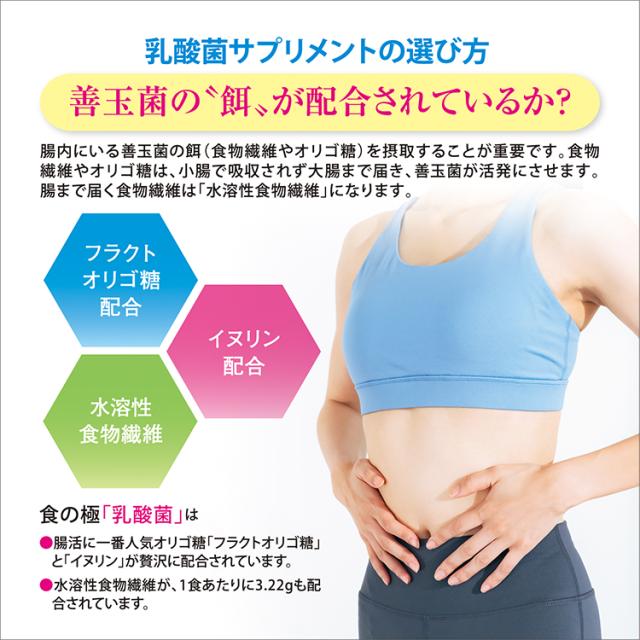 【原材料】フラクトオリゴ糖(ベルギー製造)、イヌリン(食物繊維)、マルトデキストリン、乳酸菌末、ラクトース /微結晶セルロース、グリセリン(一部に乳成分・大豆を含む)