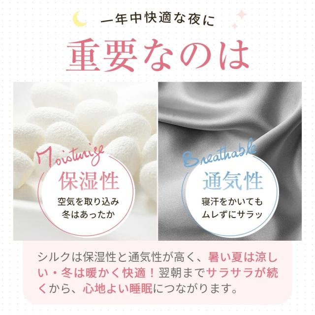 シルク素材は保湿性と通気性に優れ、肌の水分を逃さずしっかりキープします。冬は暖かく、夏は涼しく感じられるため、季節を問わず快適にお使いいただけます。蒸れにくく、一晩中さらっとした快適な眠りをサポートします。