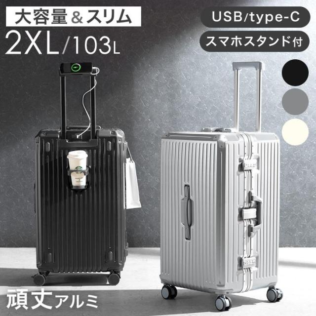 大容量 多機能 キャリーケース 頑丈 アルミフレーム 2XLサイズ アルミ USB type-c カップホルダー スマホスタンド ストッパー付き スーツケース キャリーバッグ L おしゃれ 軽い かわいい 海外旅行