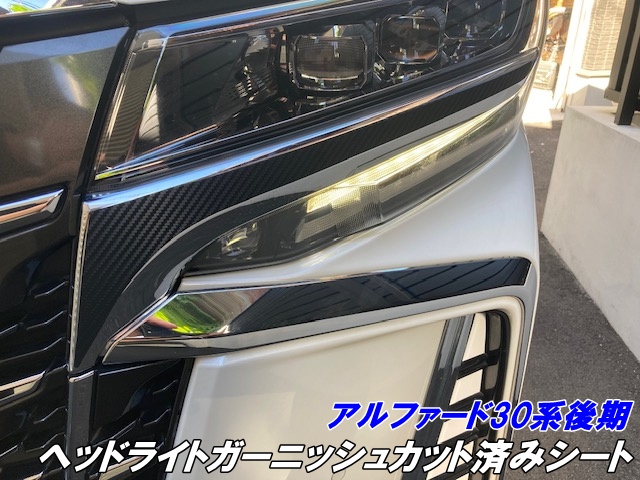 アルファード30系後期 ヘッドライトガーニッシュ カット済シート カーボン柄ブラック等カラー選択 メッキ隠し アイライン カスタムパーツ