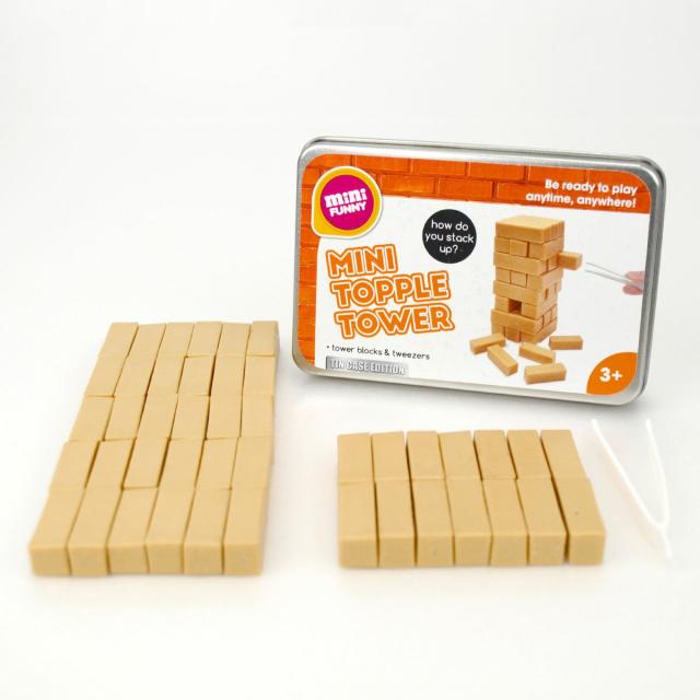 卓上や床などでサッと持ち出して遊べる、ミニチュアサイズのバランスタワーです。ピンセットではさんで抜いていく方法なので、通常サイズと比べて難易度が高いです。