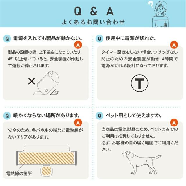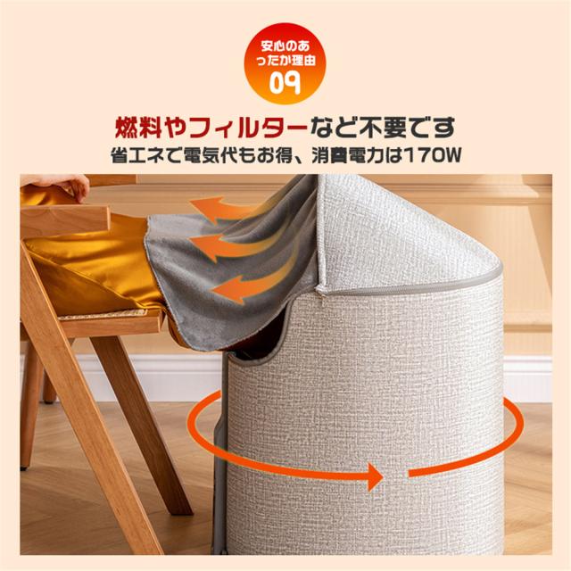 巻き取り式で、収納バンドも付きて、持ち運びも収納もしやすいです。机の下に収まれるコンパクトサイズで、足もとに置いておけばいつでもサッと使いやすいです。どんなシーンでも使いやすい。暖房がない台所、洗面所、トイレ、脱衣場、書斎にも使用できる。猫や犬などのペットも使用できます。