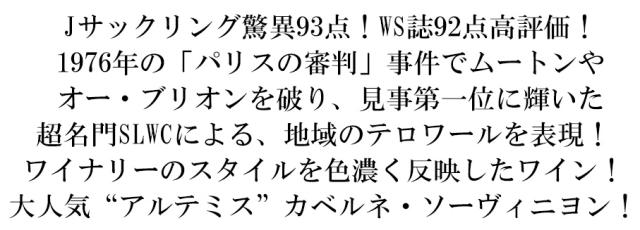 Jサックリング驚異93点!WS誌92点高評価! 1976年の「パリスの審判」事件でムートンや オー・ブリオンを破り、見事第一位に輝いた 超名門SLWCによる、地域のテロワールを表現! ワイナリーのスタイルを色濃く反映したワイン! 大人気“アルテミス”カベルネ・ソーヴィニヨン!