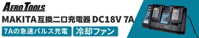 >AERO TOOLSブランドから登場した7Aの急速パルス充電対応の「マキタ互換二口充電器 DC18V 7A」はこちら