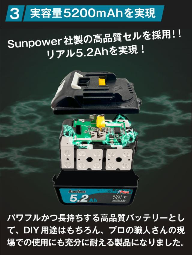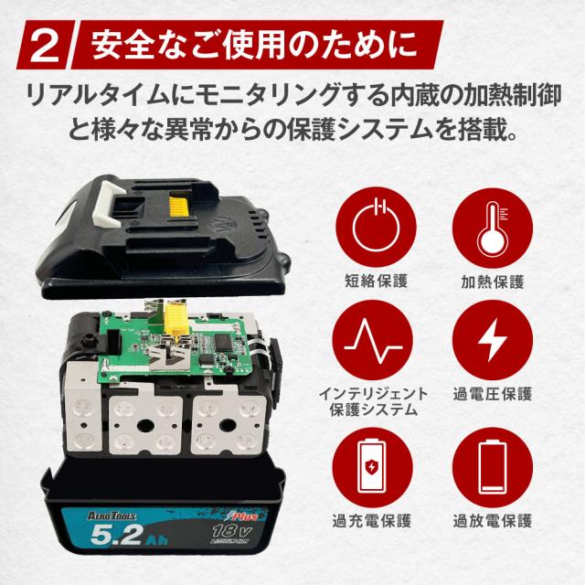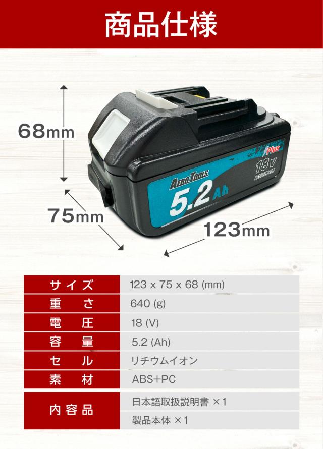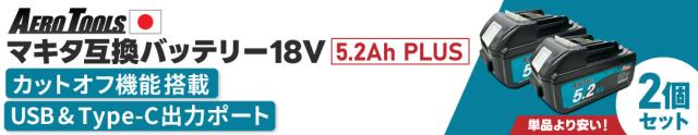 | 商品名 | AERO TOOLS マキタ互換バッテリー5.2Ah Plus |