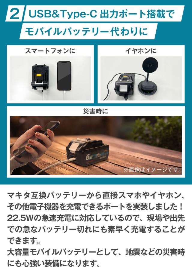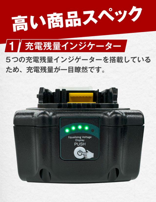 | 商品特徴 | ■保証について 12ヶ月の長期保証は製品への自信の証。 製造物責任保険でカバーされているので、万が一の不具合等にもお客様窓口にて対応いたします。 安価な粗悪品で苦労されている方にオススメです。 ■カットオフ(過放電防止)機能を搭載 入力電圧が12Vを下回ると電流がカットオフされる機能を搭載しました。 これにより、『過放電によるバッテリーの劣化を防ぐことによるバッテリー寿命の伸び』『過放電によるバッテリーの膨張や発熱の防止』『適切な電圧で動作を停止することで、低電圧での動作で工具のモーターや電子部品に損傷を与えることを防ぐ』などの効果があります。 ■USB QC3.0&PD(Type-C)出力ポートでモバイルバッテリー代わりに マキタ互換バッテリーから直接スマホやイヤフォン、その他電子機器を充電できるポートを実装しました。 22.5Wの急速充電に対応しているので、現場や出先での急なバッテリー切れにも素早く充電ができます。 108Whの大容量モバイルバッテリーとして、地震などの災害時にも心強い装備になります。 ■実容量5200mAh 5.2Ah PLUSはサンパワー社製の2500mAhセルを採用により、リアルな実容量5.2Ahを実現しました。 5つのLEDランプで正確なバッテリー残量を表示。 パワフルかつ長持ちする高品質バッテリーとして、一般ユーザーのDIY用途はもちろん、プロの職人さんの現場での使用にも充分に耐える製品になりました。 ■もちろんPSE認証済み 「特定電気用品以外の電気用品」のPSE適合基準に基づいた生産、製品管理を行っていることを経済産業省に届け出ています。 PSE認証は日本国内に電気用品を輸入する事業者自身が届け出る必要があり、シェードでは全てのPSE認証が必要な製品について適合検査と届け出を行っています。 ■PL保険加入済みで万一の場合も手厚くサポート メーカーがPL保険(生産物賠償責任保険)に加入しているため、製品の初期不良などはもちろんのこと、万が一製品に起因する事故が起きてしまった場合でも必ず責任を持って対応いたします。 ■日本語説明書付き 海外業者の販売する互換バッテリーとは違い、日本語の製品マニュアルを同梱しています。 ■マキタの同電圧全機種に対応 マキタ純正の電動工具はもちろん、草刈機、掃除機、集塵機、ブロアー、空気入れなど18Vの機種には全て対応しており、問題なくご使用いただけます。 ■マキタ純正充電器で充電可能 DC18RC、DC18RF、DC18RAなどの純正バッテリー充電器での充電が可能です。 |