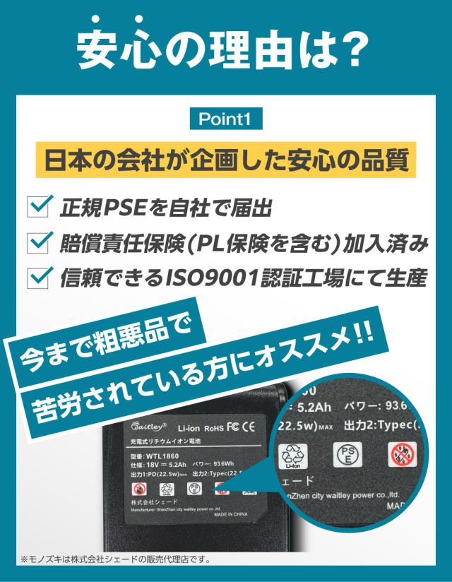 日本の会社が安全性や品質にこだわって企画し、正規のPSEの届け出を自社で行い、ISO9001認証の信頼できる中国工場にて生産しているMAKITA 互換バッテリーです。
