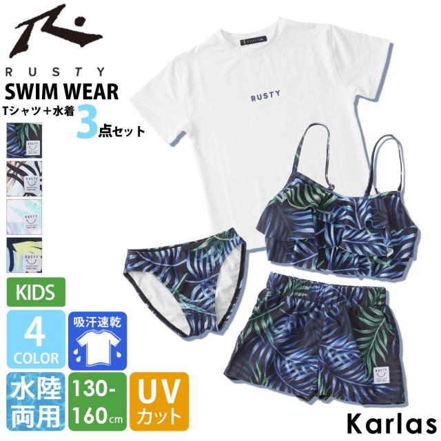 【30%OFF】水着 キッズ 女の子 タンキニ 4点セット 可愛い セパレート 水陸両用 UVカット RUSTY ラスティ 子供 ジュニア 花柄 ラッシュガード 付き ブランド ロゴ 夏 カップ付き 130 140 150 160 outfit 2024ss