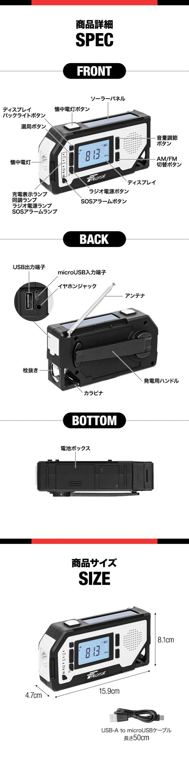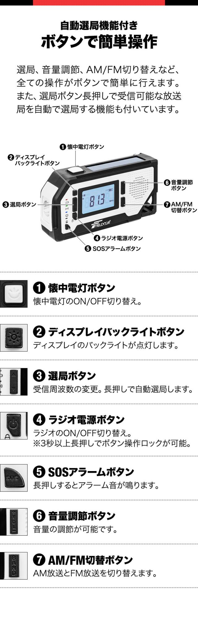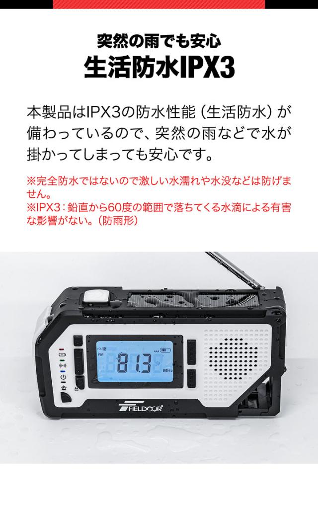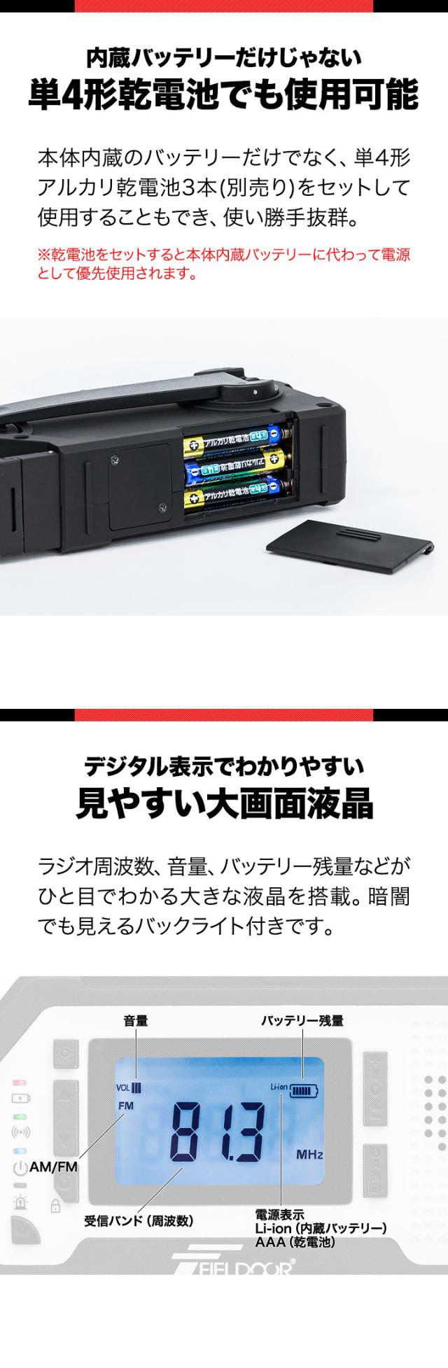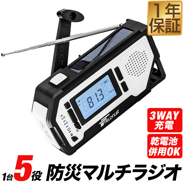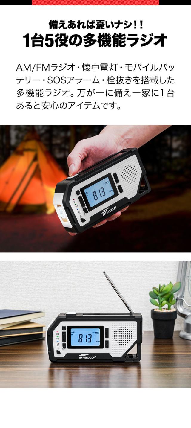 FIELDOOR 防災ラジオ 多機能 USB充電 乾電池 手回し ソーラー AM/FM ラジオ LEDライト SOSアラーム スマホ充電 2000mAh モバイルバッテリー ソーラー充電 イヤホン 多機能防災ラジオ ポータブルラジオ 防災グッズ 懐中電灯 1年保証 送料無料