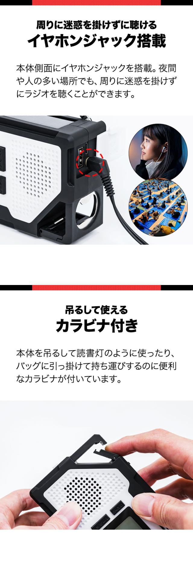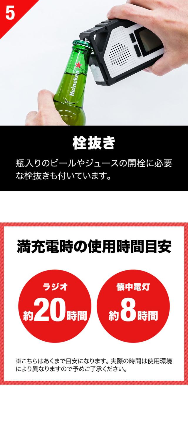 | 特記事項: ※誤作動を防ぐため、お届け時はボタン操作がロックされた状態になっています。各操作の前に、電源ボタンを3秒以上長押しし、ロックを解除してください。再度ボタンを3秒以上長押しするとロックがかかります。 ※内蔵バッテリーを活性化させるため、最初に使用するときはハンドルを130〜150回転/分の速度で3〜5分間ほど回してください。 ※乾電池をセットすると内蔵バッテリーに代わって電源として優先使用されます。 ※クリアな音でラジオを聞くためにアンテナを伸ばして使用してください。 ※選局ボタンを長押しすると受信可能な放送局を自動で選局します。 |