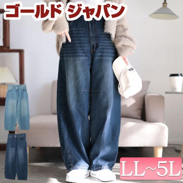 秋新作 大きいサイズ レディース パンツ ズボン コットンデニムカーブパンツ ボトムス デニムパンツ ワイドパンツ カーブパンツ ロング デニム ジーパン ジーンズ ポケット バルーン カーブ ひげ 冬服 春服 秋服 夏 LL 2L 3L 4L 5L ネイビー ライトブルー ゴールドジャパン