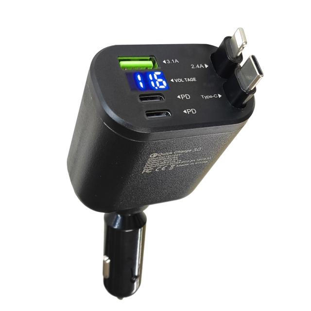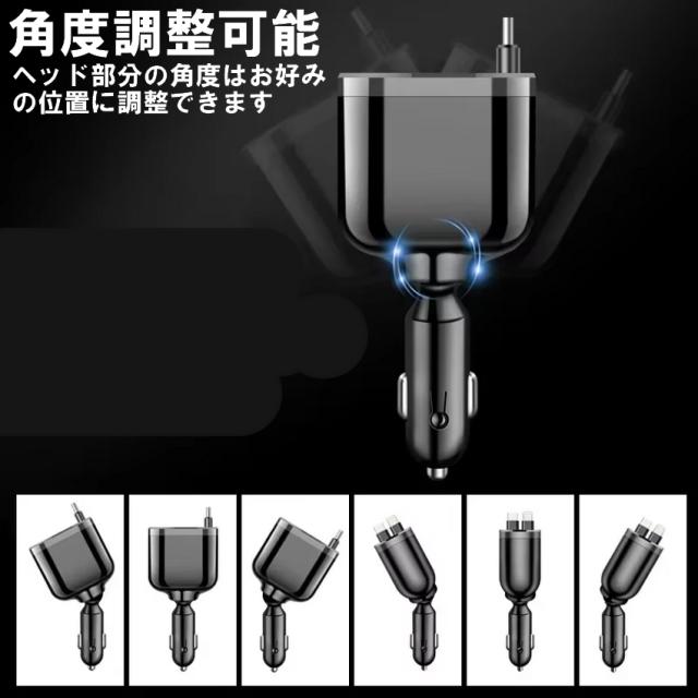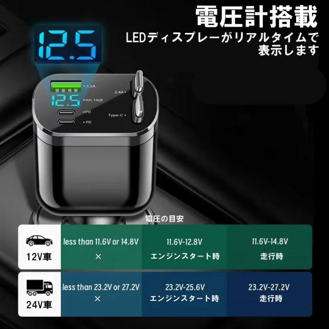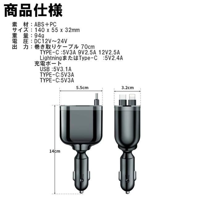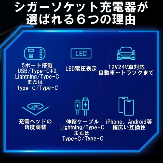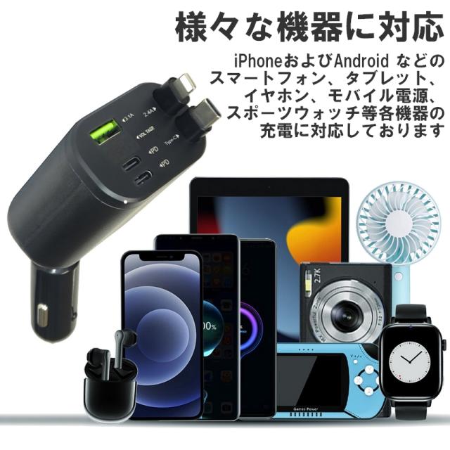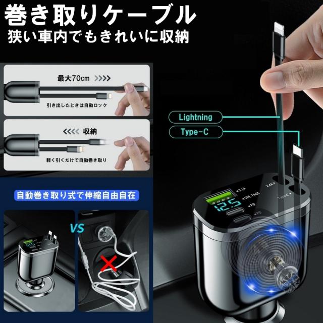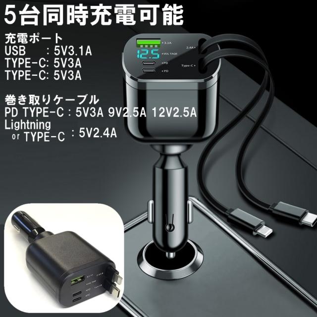 シガーソケット 充電器 巻き取り式 リール式 車載 PD急速充電 5台同時充電 5ポート Lightning Type-C カーチャージャー ライトニング タイプC ケーブル 充電器 車用 5in1 iPhone 15 16 高速充電器 充電ケーブル Apple Android USBポート 巻き取りケーブル 電圧計 12V車 24V車