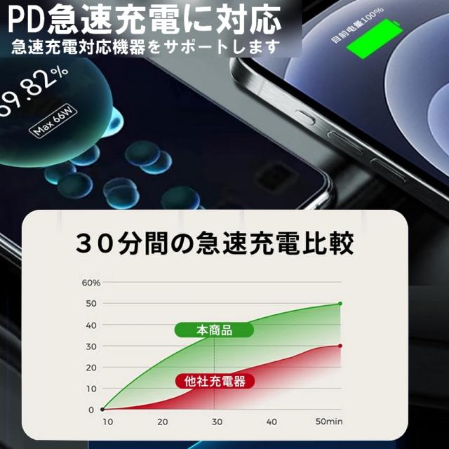 12V-24Vの車に適用、ほぼ全てのシガーソケット装備車で使用可能です。iPhone、Type-C、Androidなどのスマートフォン、スマートウォッチ、タブレット、イヤホン、モバイルバッテリーなどの機器の充電に対応し急速充電が可能です。