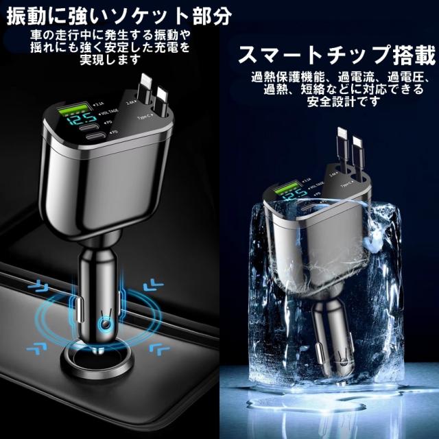 このシガーソケット充電器は、iPhone15以降やAndroidで使用できるType-CとiPhoneのLightningまたはType-Cの機器の巻き取り式充電ケーブルと、USB-Aポート*1、USB-Cポート*2の3つの急速充電ポートが付属していて、5台のデバイスを同時に充電できます。