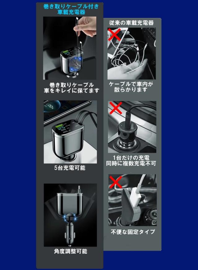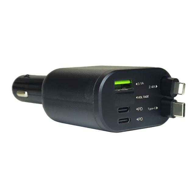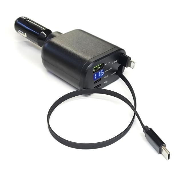 この車載用シガーソケット充電器は、巻き取り式のリールデザインで、狭い車内でもケーブルをすっきりと収納できます。 |