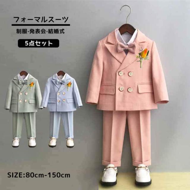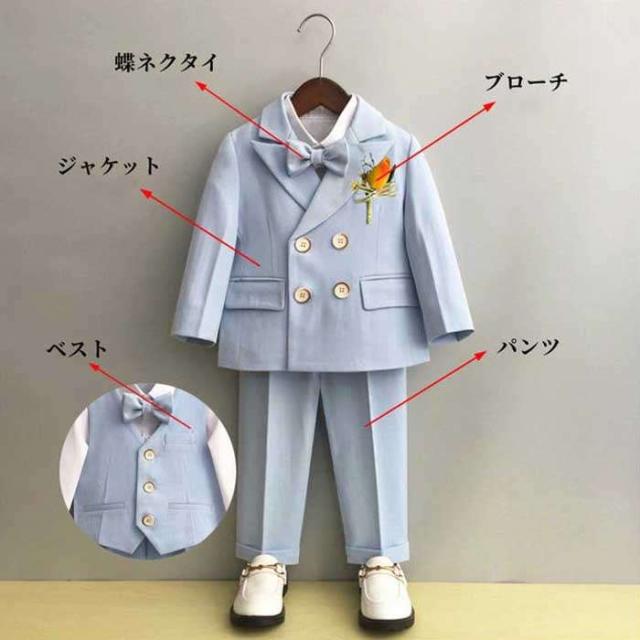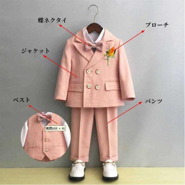 商品名:子供スーツ 男の子 スーツ フォーマルスーツ 韓国スーツ キッズスーツ ベビースーツ 5点セット ジャケット パンツ ベスト 蝶ネクタイ ブローチ スーツセット 上下セット こども ジュニア 演出服 結婚式 制服 春秋 卒園式 入学式 入園式 発表会 卒業式 ピアノ発表会 七五三 幼稚園 小学生 80cm-150cm