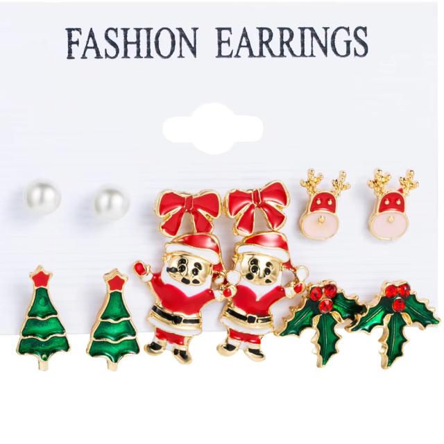 イミテーションの真珠パールピアス、赤いリボンのピアス、トナカイのピアス、赤い星をデザインしたクリスマスツリーのピアス、サンタクロースのピアス、柊のピアスの6ペアセットにした可愛い冬のクリスマスピアス。