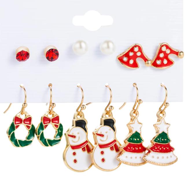 赤色のジュエルピアス、イミテーションの真珠パールピアス、赤色の帽子ピアス、赤いリボンのリースのピアス、雪だるまのピアス、カラフルなクリスマスツリーのピアスの6ペアセットにした可愛い冬のクリスマスピアス。