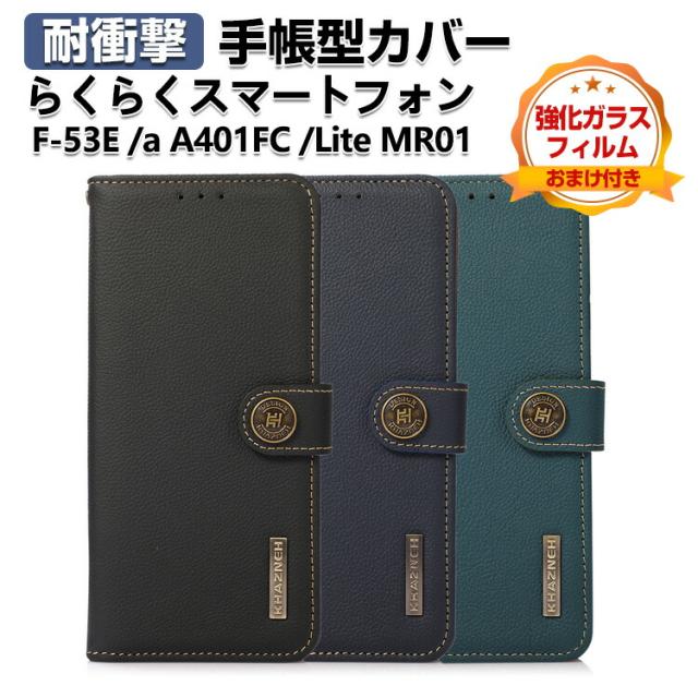 FCNT らくらくスマートフォン F-53E /a A401FC /Lite MR01 ケース カバー 耐衝撃 財布型 TPU&PUレザー スタンド機能 カード収納 便利性の高い 人気 ストラップホール付き 手帳型カバー CASE 強化ガラスフィルム おまけ付き